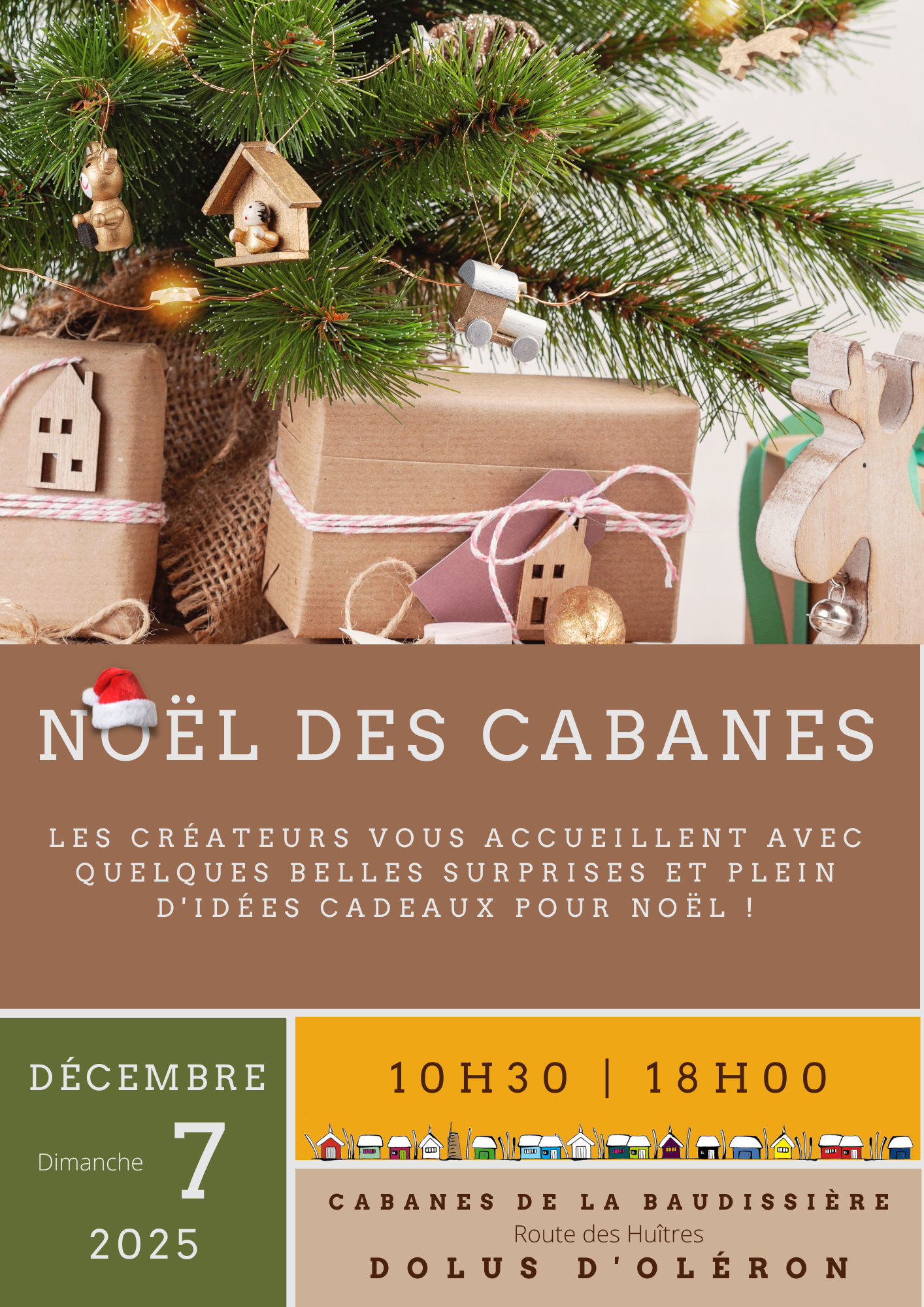 Een magische plek La Baudissière, gelegen in Dolus d'Oléron langs het kanaal op de Route des Huîtres, is een betoverende plek die tot leven komt tijdens de zomer en Allerheiligen en die elk jaar in het eerste weekend van december wordt omgetoverd tot een magische kerstmarkt. De designhutten, die kenmerkend zijn voor deze plek, zijn versierd met schitterende decoraties en nodigen bezoekers uit om zich onder te dompelen in de magie van het feestseizoen.